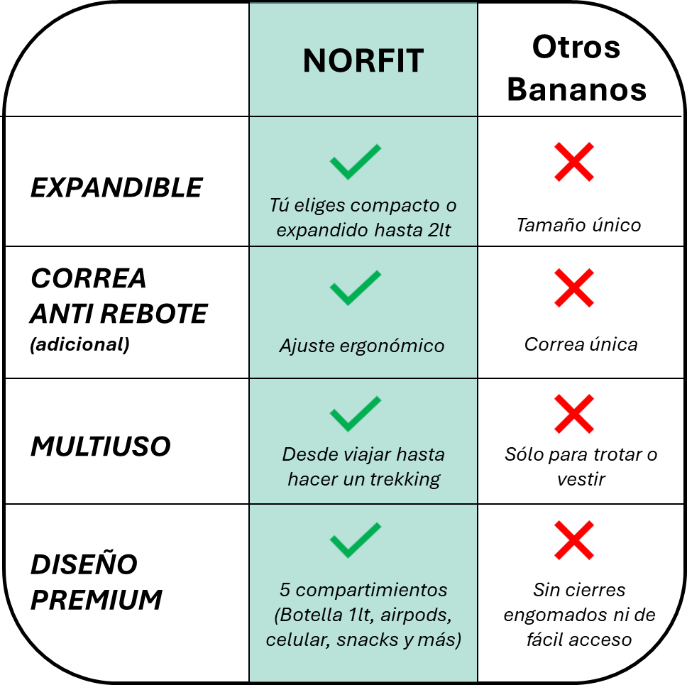 El Banano NORFIT es el único con expandible como una maleta, con un cierre de 360° permite mantener tus pertenencias seguras.